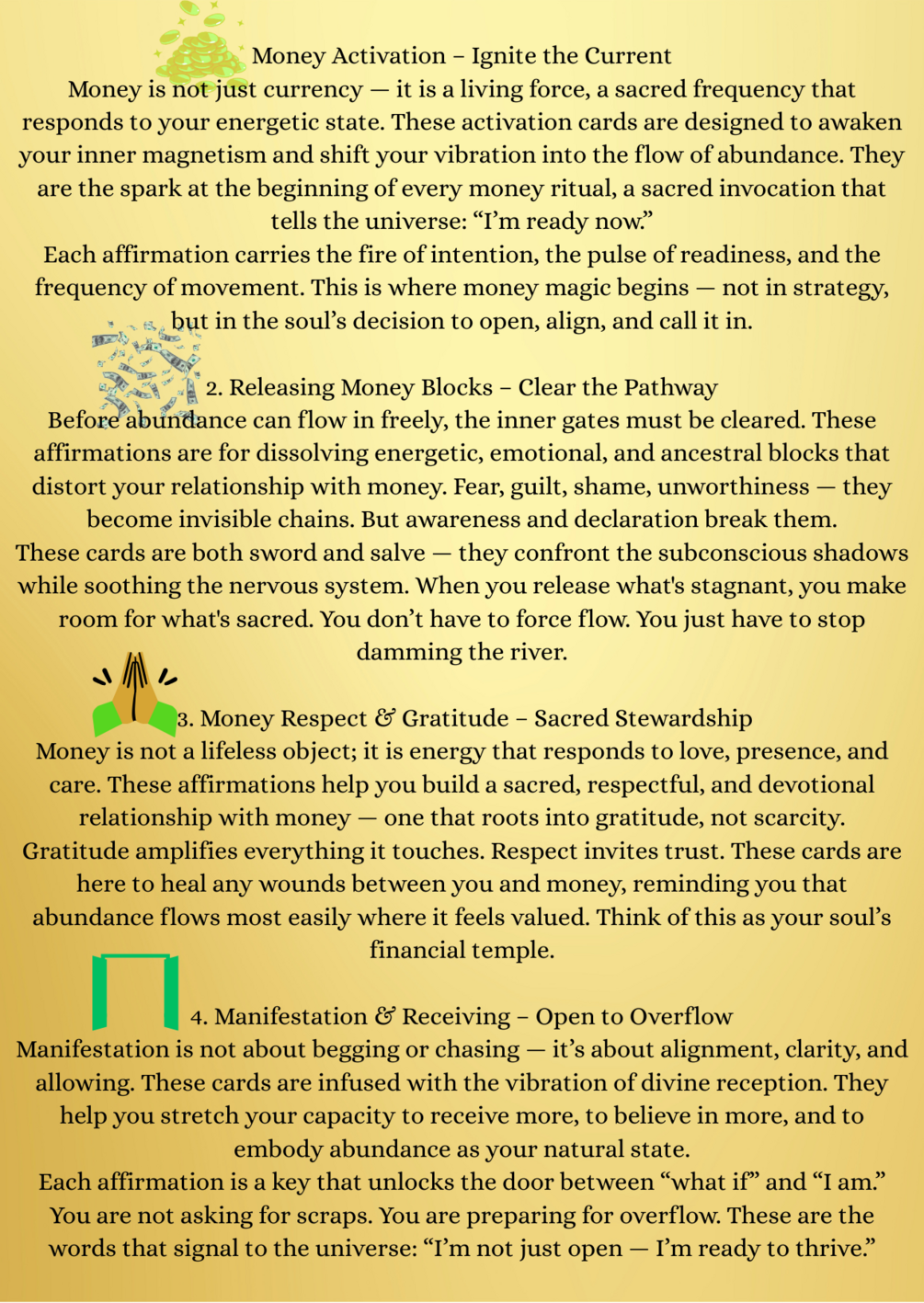 Each card carries a two-line affirmation infused with spiritual intention and energetic clarity. Use them for daily rituals, money mindset work, journaling prompts, or to support your financial healing journey.